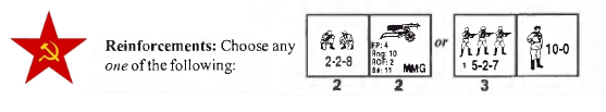 | Misc Rules: | D: 4 MMC may move Turn 1; 8 MMC may move on Turn 2, then open movement |