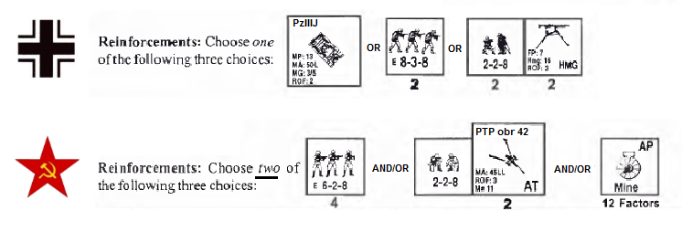 | AFVs: A:9 PzKpfw IIIJ x 2 PzKpfw IIIH x 3 PzKpfw IVF2 SPW 251/1 x 3 |