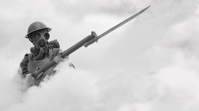Towards the end of 1917, the armies in Europe had grown weary of the continual slaughter of trench warfare. Some French troops had even mutinied and refused to attack. A breakthrough was desperately needed. The Allies attempted it in the Battle of Passchendaele. It would prove to be another massive slaughter of young men in battle. The area to be attacked was of great importance because of a high ridge controlled by the Germans. If a breakthrough could be achieved, the British could then move north and flank the Germans. The Australian 4th and 5th Divisions would lead an attack. On September 25th, the Aussies took part of Polygon Wood and Black Watch Corner at a cost of 5,000 casualties. Eight days later the Aussies attacked again. As the Australian 5th Division advanced through the smoke on the battlefield, emerging from that smoke came German soldiers, also advancing with bayonets in place.Attacker: German (41st Battalion)