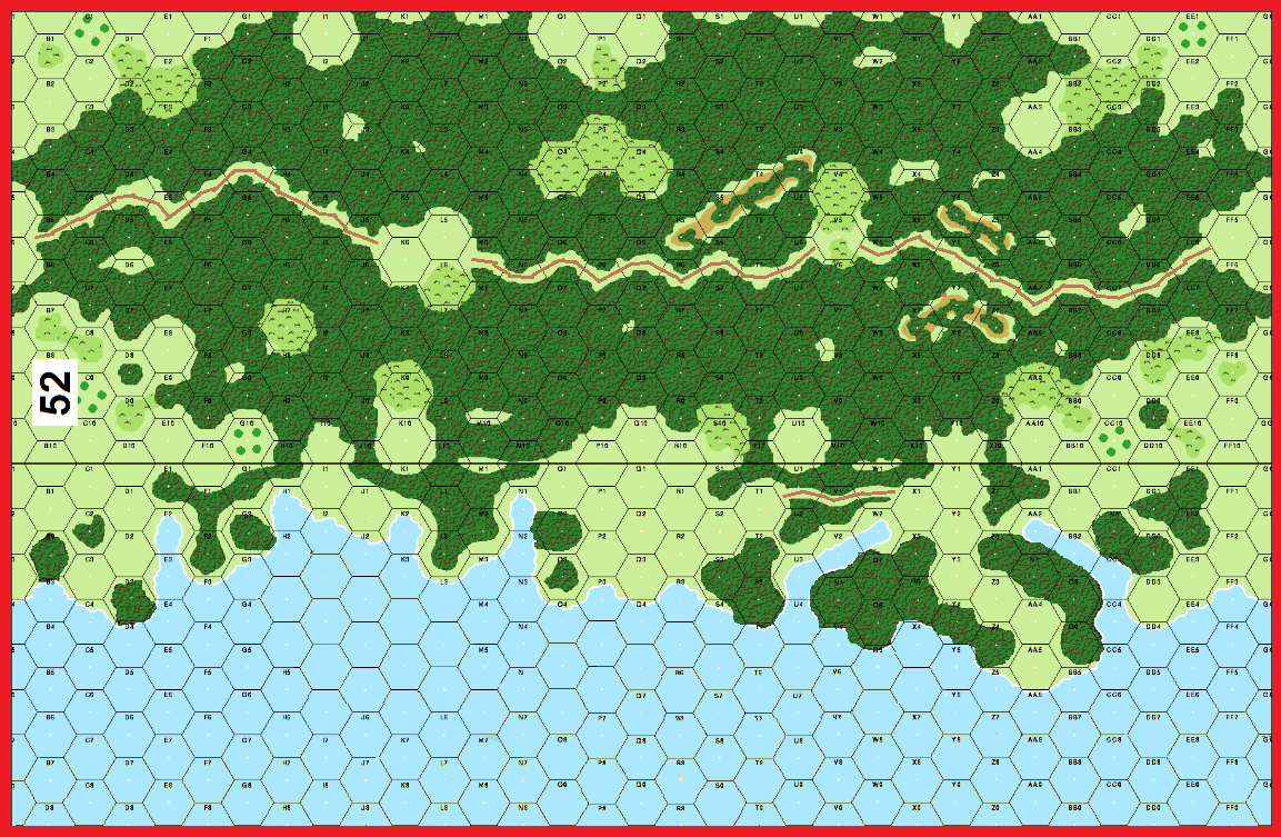 | Misc Rules: | Treat Woods-Roads as Paths. No buildings exist. Treat Marsh as Woods. A: Rafts (E5) |