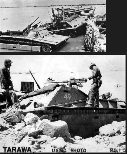 The first LVT ashore was vehicle number 4-9, nicknamed "My Deloris", the right guide vehicle in Wave One on Red Beach One, hitting the beach squarely on the 'bird's beak'. Very few of the LVTs could negotiate the seawall. Stalled on the beach, the vehicles were vulnerable to pre-registered mortar and howitzer fire, as well as hand grenades tossed into the open troop compartments by Japanese soldiers on the other side of the barrier.Attacker: American (USMC) (2nd Marine Division)