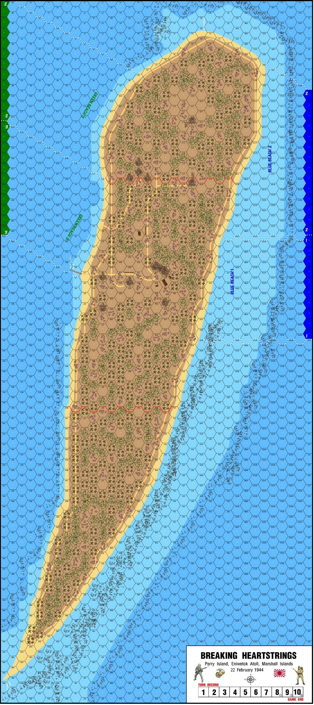 TM INFORMATION AND A VASL MAP CAN BE FOUND ON THE LONE CANUCK WEBSITE UNDER "ASL FOR FUN". . . .BREAKING HEARTSTRINGS (BHS) offers two OR MORE players a series of interrelated scenarios covering the capture of Parry Island, located in the southern part of the Eniwetok Atoll, of the Marshall Islands, by the United States Marine Corps (USMC) on 22-23 February 1944. Using this system, four “Assault Periods” (each considered a scenario of 8 to 10 turns) are played, simulating crucial moments of the actual battle. TEAM PLAY: The BHS Tactical Mission (TM) is easily adapted (and indeed, recommended) for play by teams. Each player may command one or more of the formations listed (especially suitable for the Marines), an overall commander may be appointed for either side, so that final decisions regarding commitment of forces, allocation and resolution of air and NOBA support, placement of fortifications, and/or adjustments of friendly forces prior to each Assault Period rest with that player.Attacker: American (USMC) (Elements 22nd Marine Regiment, 6th Marine Division)