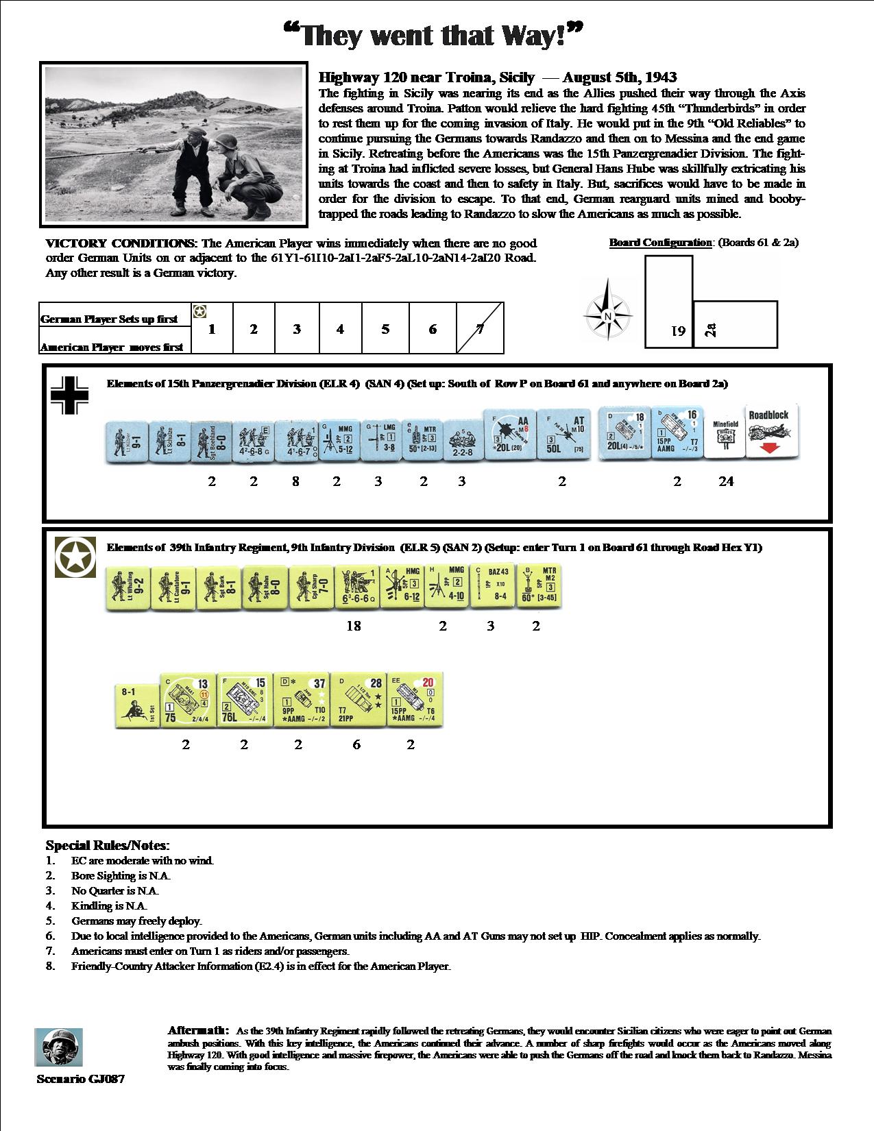 The fighting in Sicily was nearing its end as the Allies were pushing their way through the Axis defenses around Torina. Patton would relieve the hard-fighting 45th "Thunderbirds" in order to rest them for the upcoming invasion of Italy. He would put in the 9th "Old Reliables" to continue pursuing the Germans towards Randazzo and then on to Messina and the end game in Sicily. Retreating before the Americans was the 15th Panzergrenadier Division. The fighting at Troina had inflicted severe losses, but General Hans Hube was skillfully extracting his units towards the coast and then to safety in Italy. But, sacrifices would have to be made in order for the Division to escape. To the end, German rearguard units mined and booby-trapped the roads leading to Randazzo to slow the Americans as much as possible. As the 39th Infantry Regiment rapidly followed the retreating Germans, they would encounter Sicilian citizens who were eager to point out German ambush positions. With this key intelligence, the Americans continued their advance. A number of sharp firefights would occur as the Americans moved along Highway 120.Attacker: American (39th Infantry Regiment, 9th Infantry Division)