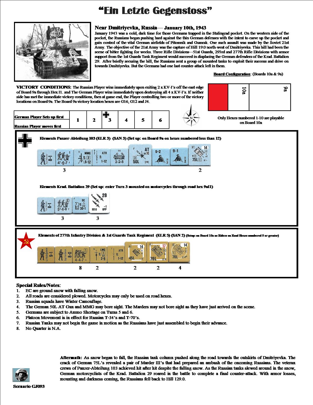 January 1943 was a cold dark time for those trapped in the Stalingrad pocket. On the western side of the pocket, the Russians were pushing hard against the thin German defenses with the intent to carve up the pocket and gain control of the vital German airfields of Pitomnik and Gumrak. One such assault was made by the Soviet 21st Army. Their objective was the capture of Hill 19.0 NW of Dmitriyevka. This hill had been the scene of bitter fighting for many weeks. The 51st Guards, the 293rd and the 277th Rifle Divisions with armor support from the 1st Guards Tank Regiment would succeed in displacing the German defenders of the Kradschützen Battalion 29. After briefly securing the hill, the Russians sent a group of mounted tanks to exploit their success and drive on towards Dmitriyevka. But the Germans had one last counter-attack left,Attacker: Russian (277th Infantry Division and 1st Guards Tank Regiment)