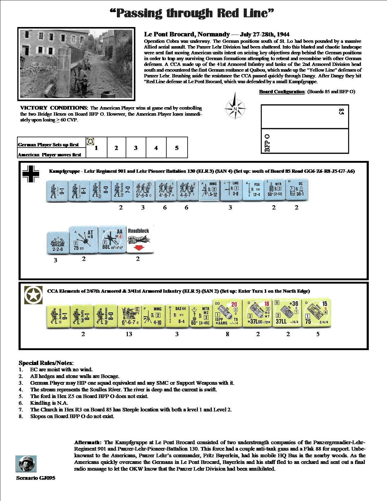 Operation Cobra was underway. The German positions south of St. Lo had been pounded by a massive Allied aerial assault. The Panzer Lehr Division had been shattered. Into this blasted and chaotic landscape were sent fast moving American units intent on seizing key objectives deep behind the German positions in order to trap any surviving German formations attempting to retreat or recombine with other German defensives. A CCA made up of the 41st Armored Infantry and tanks of the 2nd Armored Division headed south and encountered the first German resistance at Quibou, which made up the "Yellow Line" defenses of Panzer Lehr. Brushing aside the resistance, the CCA quickly passed through Dangy. After Dangy they hit the "Red Line" defense at Le Pont Brocard, which was defended by a small Kampfgruppe.Attacker: American (CCA Elements of the 2/67 Armored and 3/41st Armored Infantry)