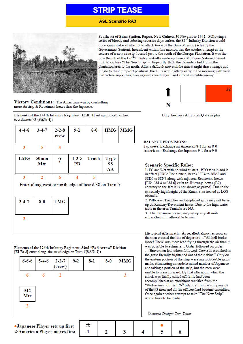 Following a series of bloody and sobering reverses days earlier, the 32nd Infantry Division would once again make an attempt to attack towards the Buna Mission (actually the Government Station). Incumbent within this mission was the another attempt at the seizure of a new airstrip located just to the south of the Duropa Plantation. It was the now the job of the 126th Infantry, initially made up from a Michigan National Guard unit, to capture “The New Strip” to hopefully flank the defenders held up in the plantation area to the north. After a difficult move in the rain at night thru swamps and jungle to their jump-off positions, the G.I.s would attack early in the morning with very ineffective supporting fires against a well dug-in and almost invisible enemy.Attacker: American (32nd "Red Arrow" Division, 126th Infantry Regiment)