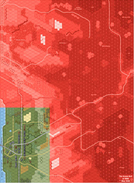 VASL setup file under USER FILES . . .On 14th May, out of fear of an encirclement, a retreat was ordered from the fortified positions on the border with Belgium that were successfully resisting the German attack. The new positions had be reconnoitered but not prepared before the move and the Germans closely followed the French troops. Inor village was supposed to be on the rear of the front but the Germans managed to slip forces through a gap in the French line to reach it. The forward elements of the 6th Infanterie Division tried to take the village by a coup de main before the French had time to organize their defense.Attacker: German (Reinforced Infanterie-Regiment 196, 6th Infanterie-Division)