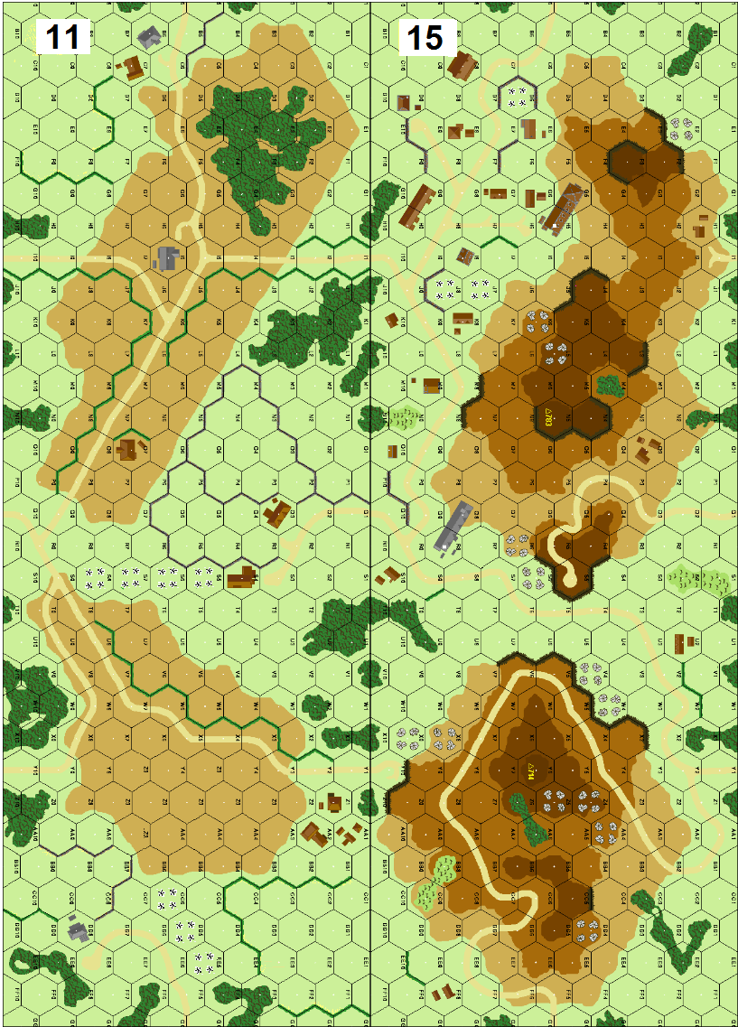 SPECIAL RULES: 1) All buildings on map 15 are wooden and worth 1 point per hex except those placed in hexes Q8 and R8 which are stone and worth 3 points per hex, at the beginning of the scenario all buildings are under Greek control. . .2) The assignment of the side with which you play is done through an auction. Before the draw, both players secretly write a number from 0 to 24, these numbers must be declared concurrently and the player who wrote the highest number plays with the Italians. . . .3) In the initial setup, both players can split their OB counters into up to 3 teams. . . .