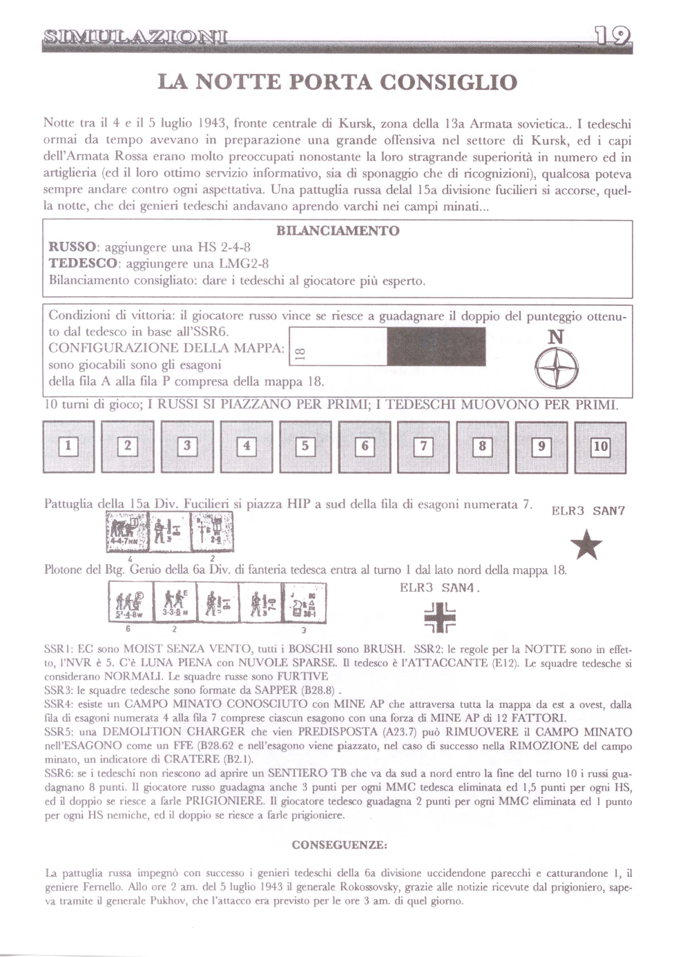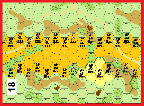 SPECIAL RULES: SSR1: EC are MOIST WITHOUT WIND, all WOODS are BRUSH ... .SSR2: Nighttime rules are in effect, NVR of 5. FULL MOON with NO CLOUDS. The German is the ATTACKER (E12). German teams consider themselves NORMAL. Russian teams are FURTIVE (Stealthy). . .SSR 3: German teams are SAPPERs (B28.8). . .SSR 4: There is a KNOWN MINEFIELD with AP MINE that traverses the entire map from east to west, from row of hexes numbered 4 to row 7 including each hex with an AP MINE strength of 12 FACTORS. . . SSR 5: a DEMOLITION CHARGE that is PREPARED (A23.7) can REMOVE the MINEFIELD in the HEX as an FFE (B28.62 and in the hex a CRATER marker is placed in the case of successful REMOVAL of the minefield. (B21.1) .. .SSR 6: If the Germans fail to open a TB PATH running from south to north by the end of turn 10, the Russians earn 8 points. The Russian player also earns 3 points for each German MMC eliminated and 1.5 points for each HS, and double if he manages to make them PRISONER The German player earns 2 points for each Russian MMC eliminated, and 1 point for each HS, and double if he manages to take them prisoner.Attacker: German (Platoon of the Engineer Battalion, 6th Infanterie Division)