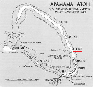 'Boxcloth' was the US seizure of Apamama atoll in the Gilbert islands group of the central Pacific Ocean (20/23 November 1943). In the middle part of October 1943, the Apamama Atoll appeared to be unoccupied by the Japanese, and the V Amphibious Corps Reconnaissance Company was given the task of reconnoitering Apamama to establish whether or not it was occupied. If occupied in strength, elements of the 6th Marines were to assault the atoll on 26 November 1943. Loaded aboard the subĀmarine Nautilus, the 68 marines and 10 engineers of the company travelled first to Tarawa and then to Apamama. The submarine was errantly attacked and damaged by a US destroyer while on its way, but was able to proceed and arrived off Apamama during the afternoon of 20 November. The company landed by rubber boat on the western side of Joe at 04.45 on the following morning: it had intended to land on John just to the east, but the current swept the company slightly to the west. The company then moved across John, in the process engaging a Japanese patrol. As they approached from Orson on 23 November, the Marines found 23 Japanese entrenched on the southern end of Otto Island, All of the gaps between the islands and islets between Apamama and Joe could be forded without difficulty at low tide, so the Marines moved to cross to Otto and take out the Japanese.Attacker: American (USMC) (Reconnaissance Company, V Amphibious Corps)