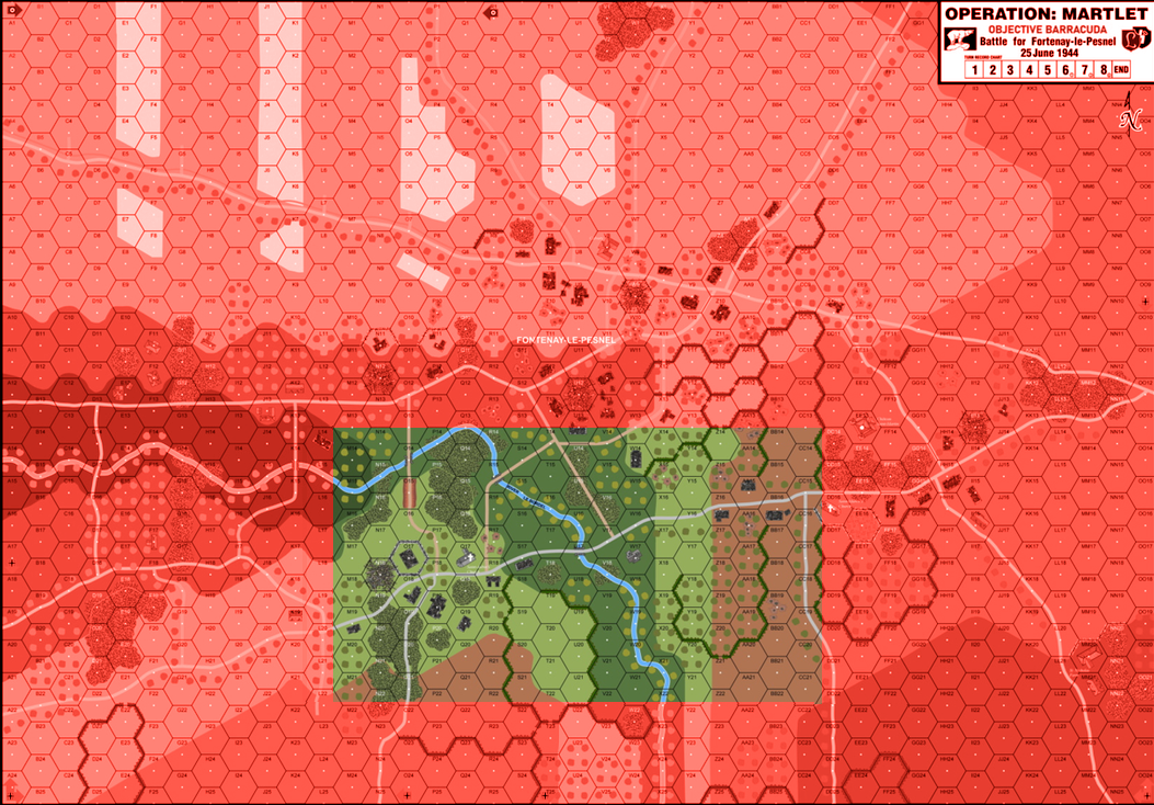 By noon the Hallamshire Battalion had reached Objective BARRACUDA (Caen-Juvigny Road). The Hallams knew a counterattack would be imminent and quickly established outposts and and anti-tank (A-T) gun screen. Within an hour, SS-Grenadiers and Panther tanks atatcked west along the road in an attempt to close the grwoing gap with Panzer Lehr. Earlier that week, the 49th (West Riding) Division commander, General "Bubbles" Barker, offered a 5 pound prize for the first gun detachment to knock-out a Panther tank. After a short exchange of fire, the Panzer IVs (mistakenly identified as Panthers) drove purposefully downhill towards the bridge over the Bordel River.Attacker: German (SS) (12 SS-Panzerdivision)