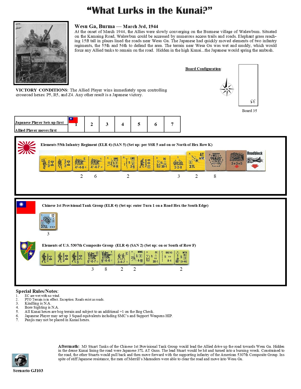 At the onset of March 1944, the Allies were slowly converging on the Burmese village of Walawbum. Situated on the Kamaing Road, Walawbum could be accessed by numerous access trails and roads. Elephant grass reaching 15 ft tall in places lined the roads near Wesu Ga. The Japanese had quickly moved elements of two infantry regiments, the 55th and 56th to defend the area. The terrain near Wesu Ga was wet and muddy, which would force any Allied tanks to remain on the roads. Hidden in the high Kunai...the Japanese would spring the ambush.Attacker: Allied (Chinese 1st Provisional Tank Group and 5037th Composite Group "Merrill's Marauders")