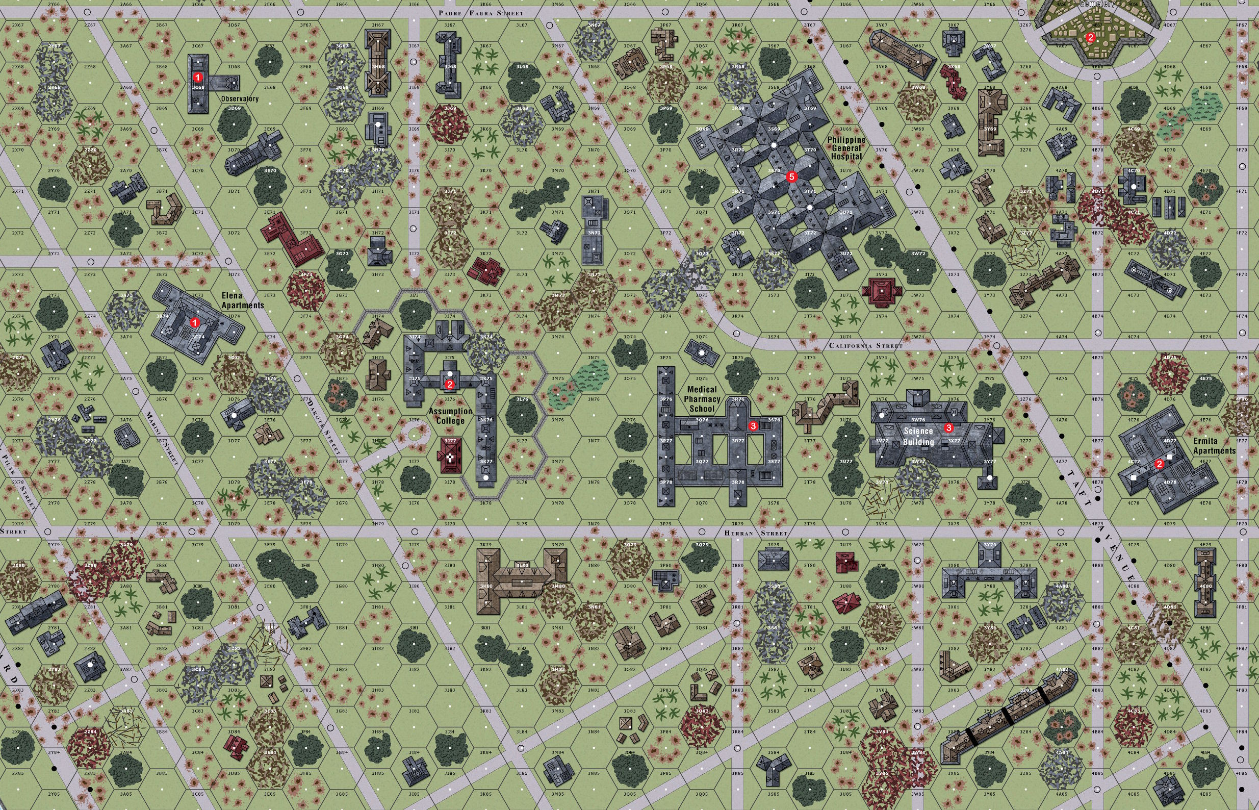 The task set before the 3rd Battalion was daunting. After two days of desperate struggle, the Japanese were still firmly in control of all major buildings within the University-Hospital complex. Barricaded within the stone and brick buildings and armed with numerous automatic weapons, the Japanese seemed to have all the advantages. Complicating the task was the fact that there were more than 7,000 civilians and hospital patients trapped or held hostage in the complex. The first American objective was controlling the two large buildings in the angle of Herran Street and Taft Avenue: the Medical School and the Science Building. As the evening shadows grew long and the artillery rounds bombarding other parts of Manila roared overhead, the men of the 3rd Battalion braced to renew their assault.Attacker: American (3rd Battalion, 148th Infantry Regiment and Division Cannon Company, 37th Infantry Division with 637th Tank Destroyer Battalion)