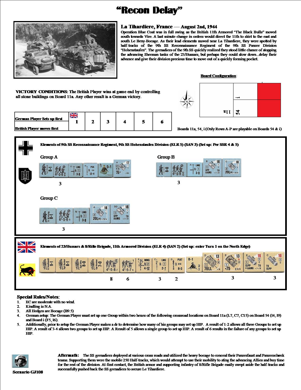 Operation Blue Coat was in full swing as the British 11th Armored “The Black Bulls” moved south towards Vire. A last minute change in orders would direct the 11th to skirt to the east and south Le Beny-Bocage. As their lead elements moved near La Tihardiere, they were spotted by half-tracks of the 9th SS Reconnaissance Regiment of the 9th SS Panzer Division “Hohenstaufen”. The grenadiers of the 9th SS quickly realized they stood little chance of stopping the advancing Sherman tanks of the 23/Hussars, but perhaps they could slow down...delay their advance and give their division precious time to move out of a quickly forming pocket. The SS grenadiers deployed at various cross roads and utilized the heavy bocage to conceal their Panzerfaust and Panzerschreck teams. Supporting them were the mobile 250 halftracks, which would attempt to use their mobility to sting the advancing Allies.Attacker: British (23/Hussars & 8/Rifle Brigade, 11th Armored Division)