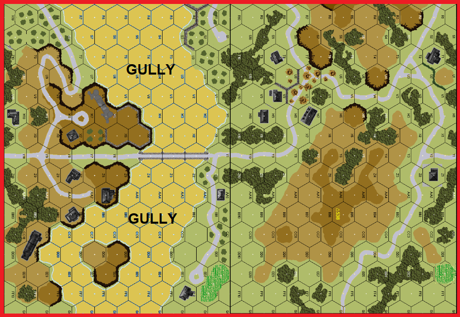 | Misc Rules: | River is Dry Gully. Grain is Vineyards, Olive Groves. Paved Rds. D: Pillbox3 |