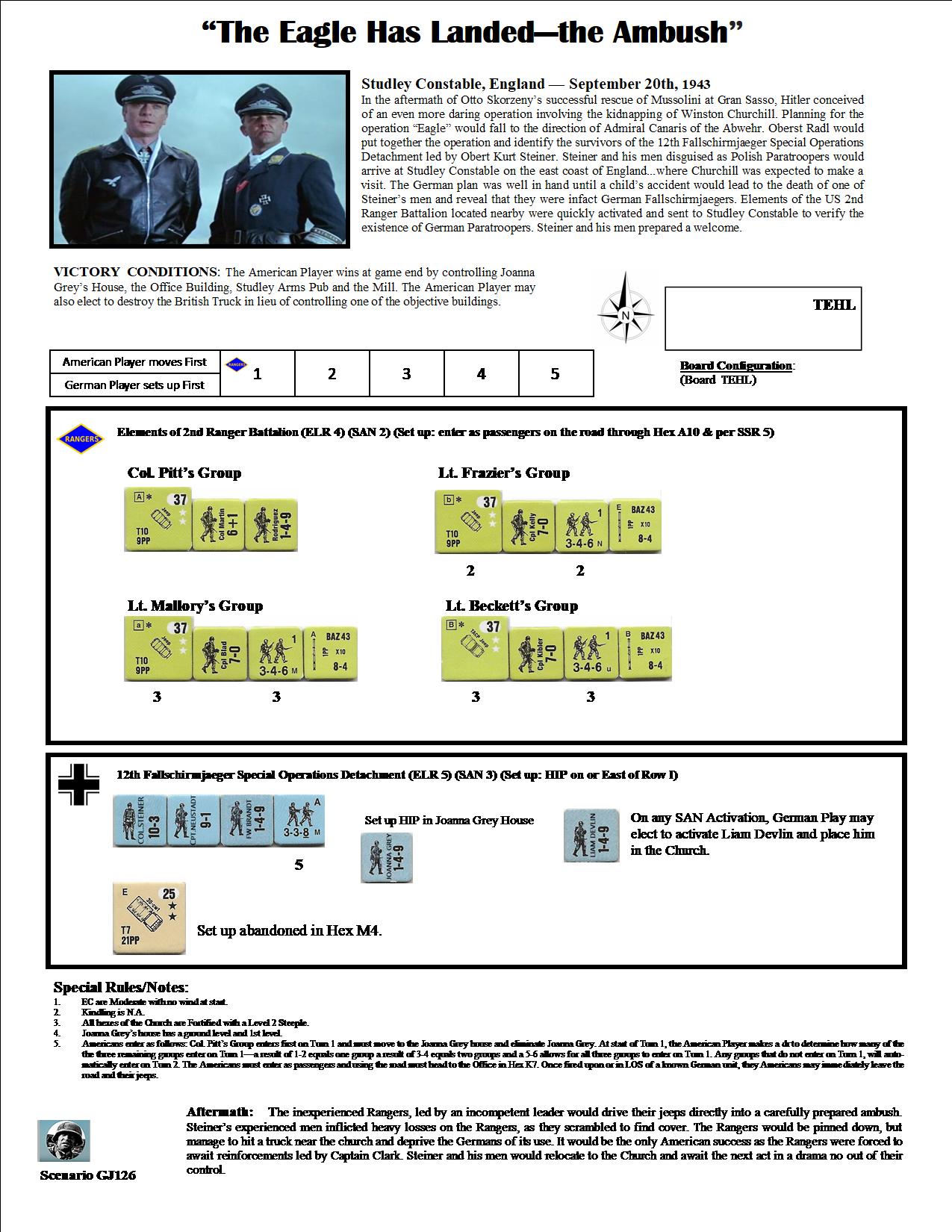 In the aftermath of Otto's Skorzeny's successful rescue of Mussolini at Gran Sasso, Hitler conceived of an even more daring operation involving the kidnapping of Winston Churchill. Planning for the operation "Eagle" would fall to the direction of Admiral Canaris of the Abwehr. Oberst Radl would put together the operation and identify survivors of the Fallschirmjaeger Special Operations Detachment led by Obert Kurt Steiner. Steiner and his men disguised as Polish Paratroopers would arrive at Studley Constable on the east coast of England...where Churchill was expected to make a visit. The German plan was well in hand until a child's accident would lead to the death of one of Steiner's men and reveal that they were in fact German Fallschirmjaegers. Elements of the US 2nd Ranger Battalion located nearby were quickly activated and sent to Studley Constable to verify the existence of German Paratroopers. Steiner and his men prepared a welcome.Attacker: American (2nd Ranger Battalion)