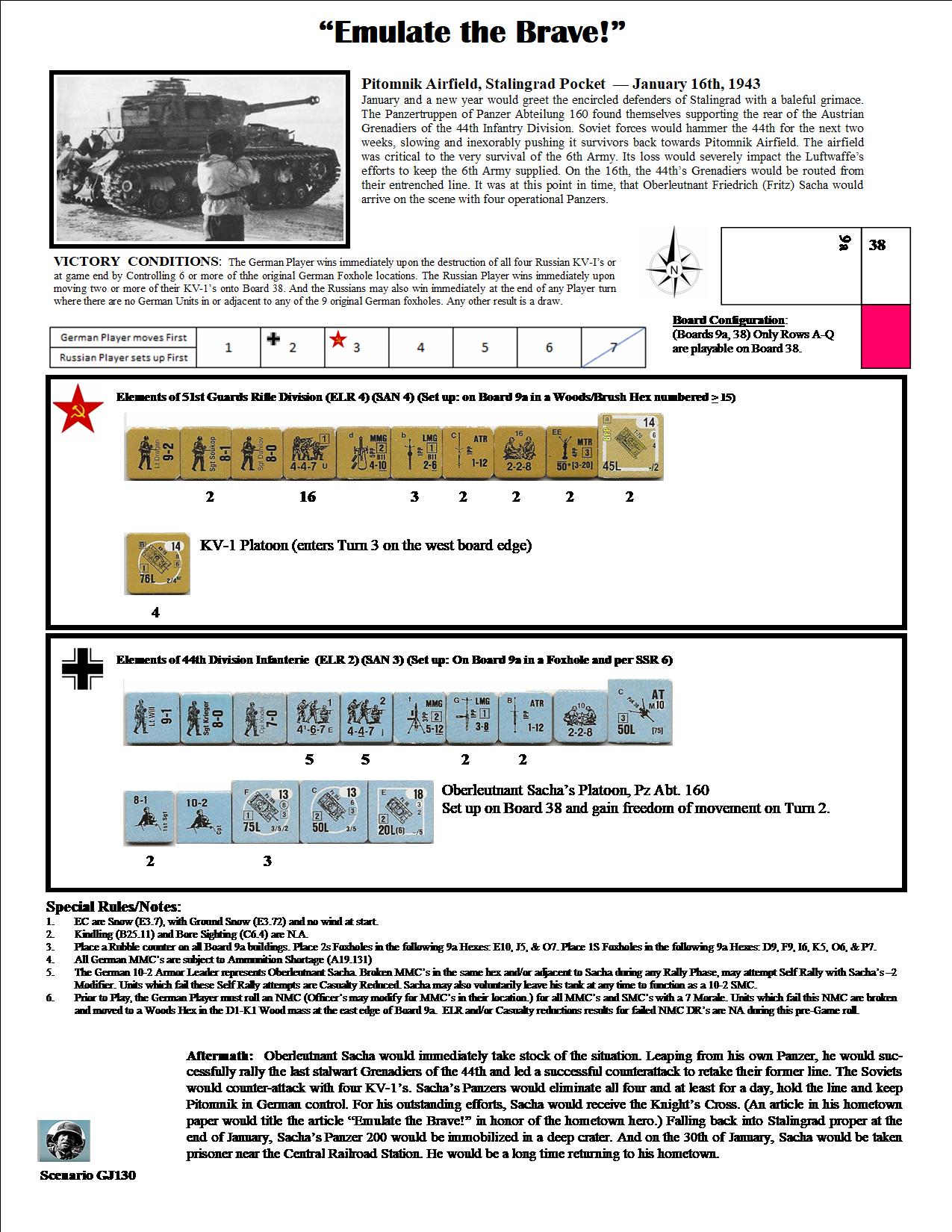 January and a new year would greet the encircled defenders of Stalingrad with a baleful grimace. The Panzertruppen of Panzer Abteilung 160 found themselves supporting the rear of the Austrian Grenadiers of the 44th Infantry Division. Soviet forces would hammer the 44th for the next two weeks, slowing and inexorably pushing its survivors back towards the Pitomnik Airfield. The airfield was critical to the very survivial of the 6th Army. Its loss would severely impact the Luftwaffe's efforts to keep the 6th Army supplied. On the 16th, the 44th's Grenadiers would be routed from their entrenched line. It was at this point in time, that Oberleutnant Friedrich (Fritz) Sacha would arrive on the scene with four operational Panzers.Attacker: German (44th Infantry Division, Panzer Abteilung 160)