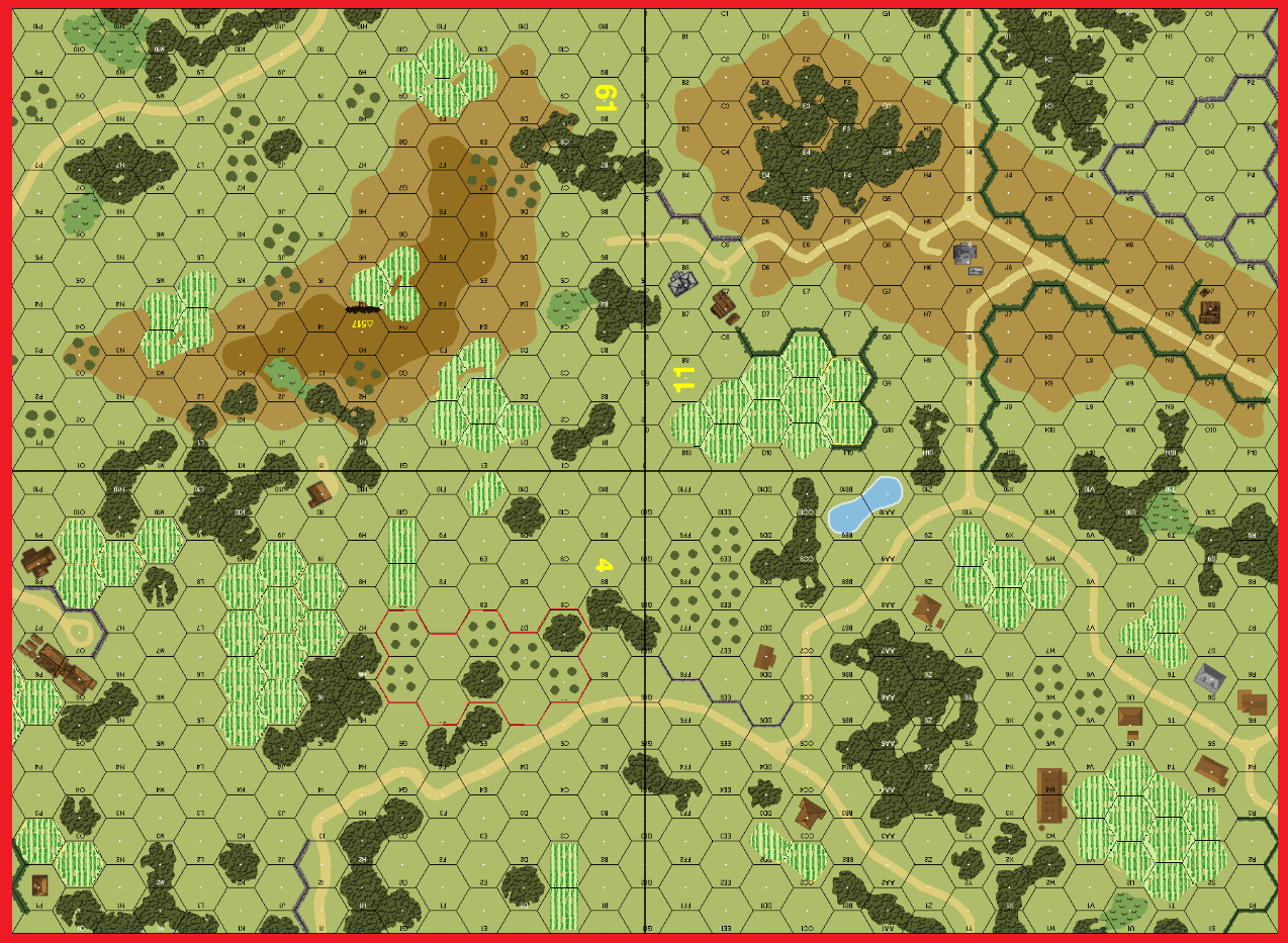 Steve decided to push up the middle with his barrage and his troops. This avoided the mines, but this will be tough for the Canucks if the guns are allowed unmolested overwatch. And that's exactly what this allowed, with a squad blown to bits in the woods by a mortar shot. Turn 2 saw the Canucks be held up by one of the MG nest FLs, as well as their own barrage, and a Sherman was knocked out trying to swing around behind cover of the eastern woods. Turn 3 the barrage jumped right over the PB. With fanaticism saving me from cowering more than once it would be tough to pass. But one of the German mortars overheated for good. Turn 4 saw the Canuck attack shift increasingly east, but as long as they were stuck down on the plains they were of little threat. Turn 5 saw the PB crew finally succumb to a casualty MC, but by this time most of the Canucks had already passed them by, and another Sherman was fried navigating the eastern road. With the barrage rolling on ahead, and still in total control of the heights, the German reinforcements were able to move up and man the hedgerow. The Canucks read the writing on the wall and spent Turn 6 pulling back and hiding, and the Germans accepted their concession with the CVP count 18-4 in their favor. With the game victory this gave them an opening round score of 8-0.