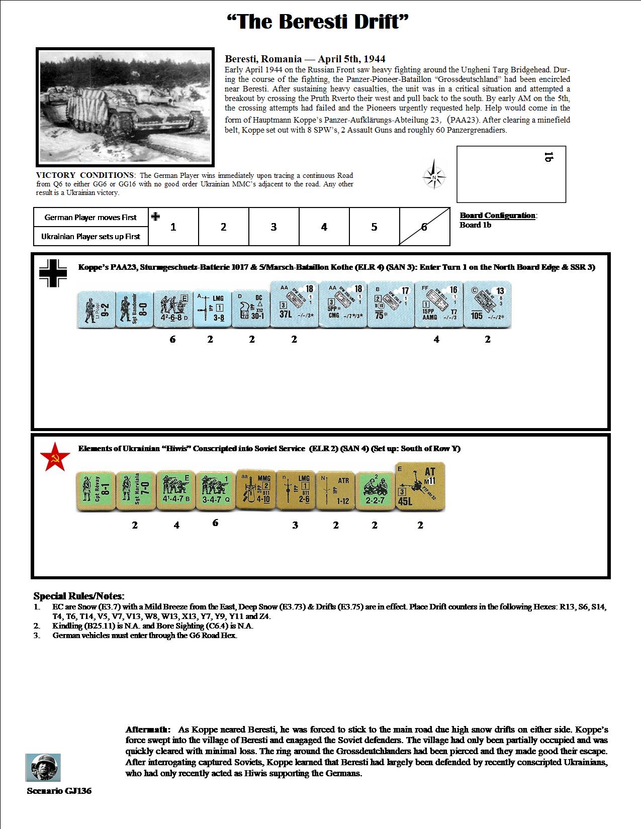 Early April 1944 on the Russian Front saw heavy fighting around the Ungheni Targ Bridgehead. During the course of the fighting, the Panzer-Pioneer-Bataillon “Grossdeutschland” had been encircled near Beresti. After sustaining heavy casualties, the unit was in a critical situation and attempted a breakout by crossing the Pruth Rverto to their west and pull back to the south. By early AM on the 5th, the crossing attempts had failed and the Pioneers urgently requested help. Help would come in the form of Hauptmann Koppe’s Panzer-Aufklärungs-Abteilung 23, (PAA23). After clearing a minefield belt, Koppe set out with 8 SPW’s, 2 Assault Guns and roughly 60 Panzergrenadiers.Attacker: German (Koppe’s PAA23, Sturmgeschuetz-Batterie 1017 and 5/Marsch-Bataillon Kothe)