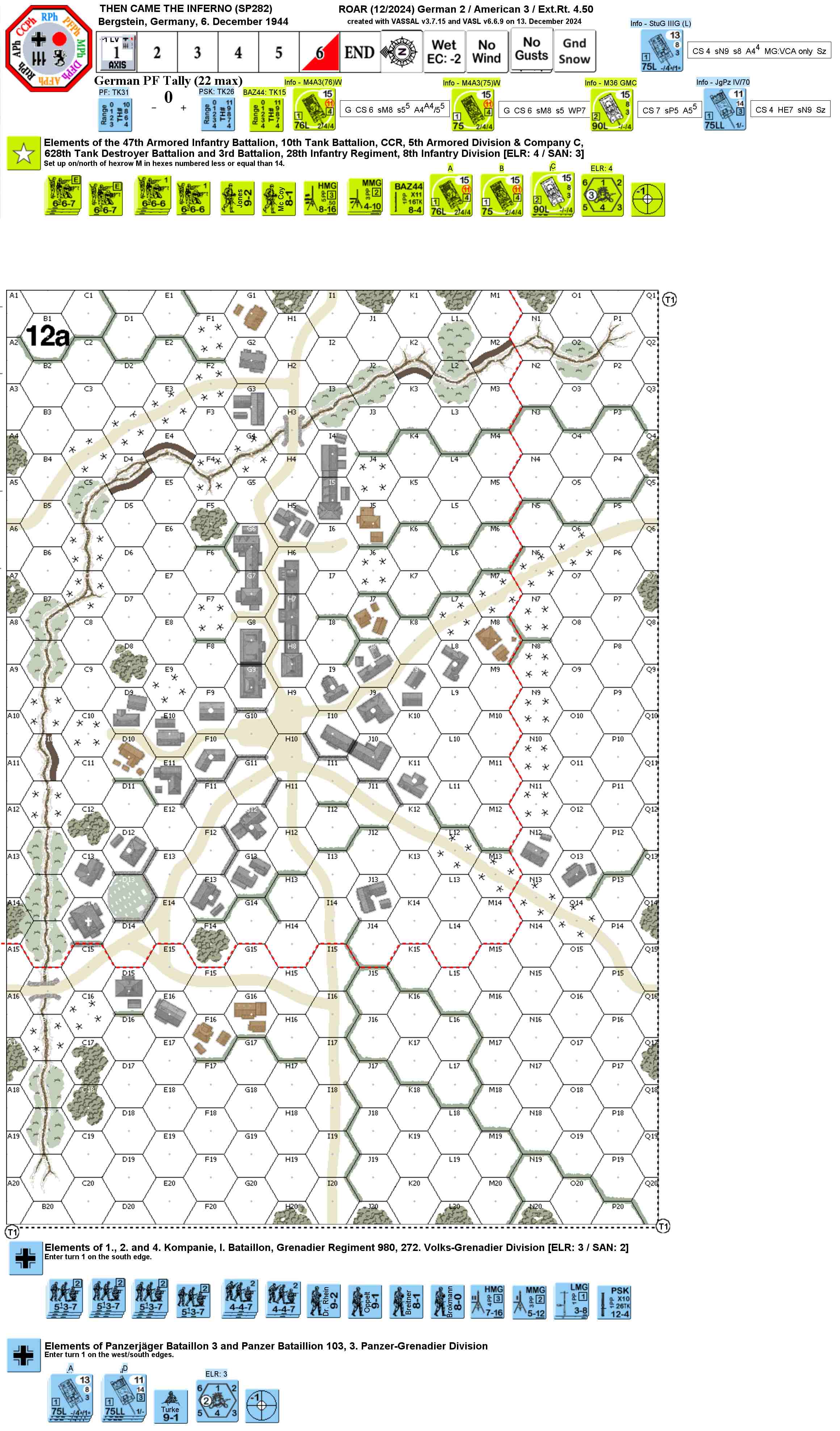 CCR, 5th Armored Division had secured Bergstein on 5 December after a very hard fight and was now consolidating its defensive positions in anticipation of the inevitable German counterattack. Generalmajor Walter Bruns directed Hauptmann Dr. Max Rhein to conduct an immediate counterattack to regain Bergstein. Rhein's 520 men of Grenadier Regiment 980 formed up south of Bergstein, where they made final coordination with Hauptmann Gerhard Turke and his four SthG IIIs and six Jagdpanzer IV/70s that would support the attack. The German attack began at 0645 as their artillery shifted fire to th northen portion of Bergstein. In the dim morning light, the grenadiers advanced across 300 meters of snow covered ground to reach the southern edge of Bergstein. The Americans held their fire...Attacker: German (Kompanien 1, 2, and 4, Bataillon 1, Grenadier Regiment 980, Volksgrenadier Division 272 and Panzerjäger Bataillon 3 and Panzer Bataillon 103, Panzer Grenadier Division 3)