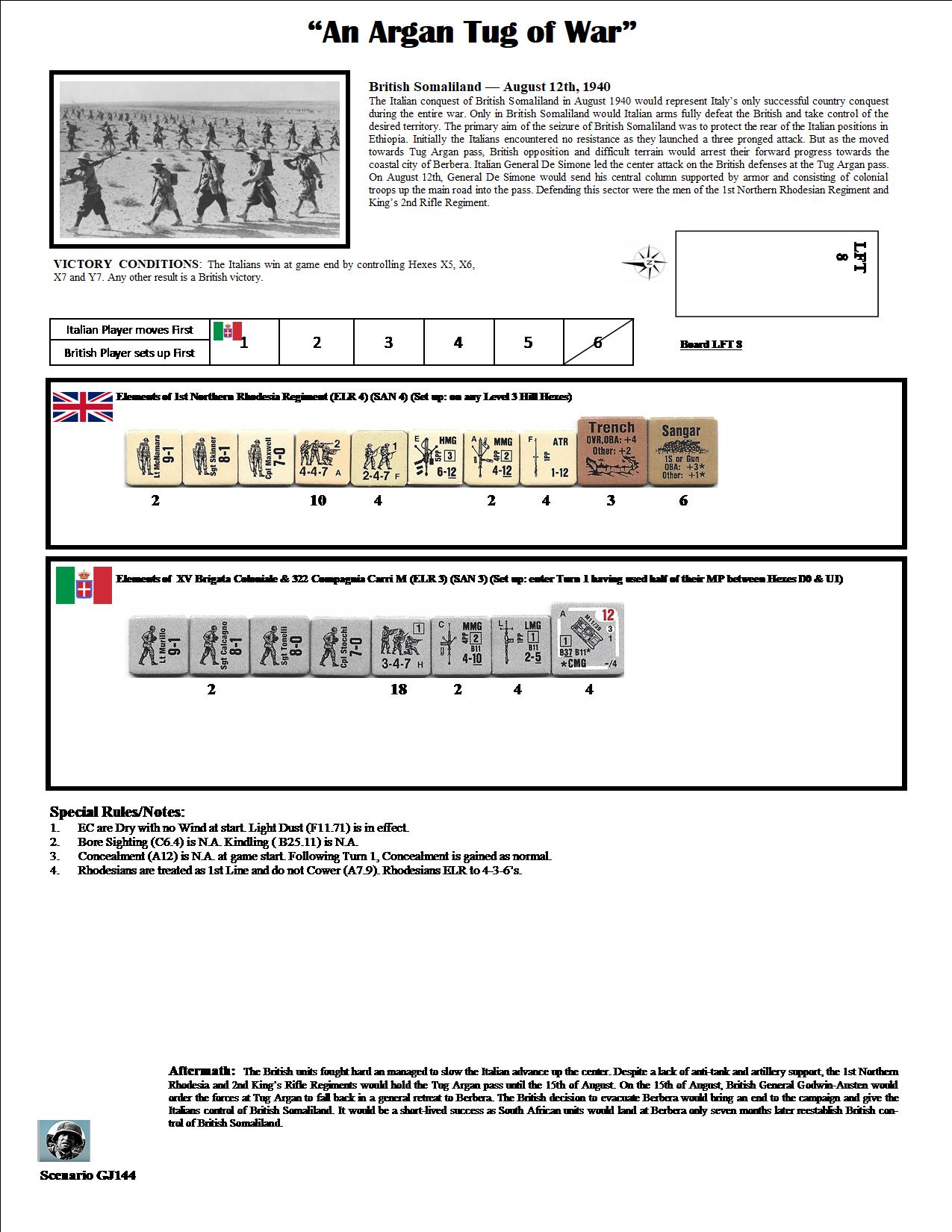 The Italian conquest of British Somaliland in August 1940 would represent Italy’s only successful country conquest during the entire war. Only in British Somaliland would Italian arms fully defeat the British and take control of the desired territory. The primary aim of the seizure of British Somaliland was to protect the rear of the Italian positions in Ethiopia. Initially the Italians encountered no resistance as they launched a three-pronged attack. But as the moved towards Tug Argan pass, British opposition and difficult terrain would arrest their forward progress towards the coastal city of Berbera. Italian General De Simone led the center attack on the British defenses at the Tug Argan pass. On August 12th, General De Simone would send his central column supported by armor and consisting of colonial troops up the main road into the pass. Defending this sector were the men of the 1st Northern Rhodesian Regiment and King’s 2nd Rifle Regiment.Attacker: Italian (XV Brigata Coloniale and 322 Compagnia Carri M)