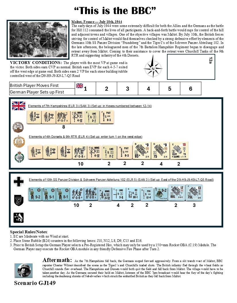 The early days of July 1944 were some extremely difficult for both the Allies and the Germans as the battle for Hill 112 consumed the lives of all participants. A back-and-forth battle would rage for control of the hill and adjacent towns and villages. One of the objective villages was Maltot. By July 10th, the British forces striving for control of Maltot would find themselves checked by a strong defensive effort by elements of the Germans 10th SS Panzer Division “Frundsberg” and the Tiger I’s of the Schwere Panzer Abteilung 102. In the late afternoon, the beleaguered men of the 7th Battalion Hampshire Regiment began to disengage and retreat away from Maltot. Coming to their assistance to cover the retreat were Churchill Tanks of the 9th RTR and supporting infantry of the 4th Dorsets.Attacker: German (SS) (10th SS Panzer Division 'Frundsberg' and Schwere Panzer Abteilung 102)