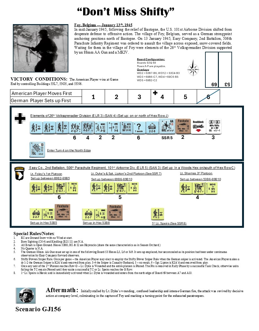 In mid-January 1945, following the relief of Bastogne, the U.S. 101st Airborne Division shifted from desperate defense to offensive action. The village of Foy, Belgium, served as a German strongpoint anchoring positions north of Bastogne. On 13 January 1945, Easy Company, 2nd Battalion, 506th Parachute Infantry Regiment was ordered to assault the village across exposed, snow-covered fields. Waiting for them in the village of Foy were elements of the 26th Volksgrenadier Division supported by an 88mm AA Gun and a MkIV.Attacker: American (E Co, 1st Batt, 506th PIR, 101st Airborne, Div.)