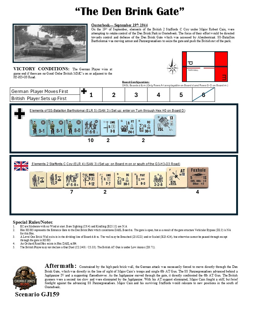 On the 19th of September, elements of the British 2 Staffords C Coy under Major Robert Cain, were attempting to retake control of the Den Brink Park in Oosterbeek. The focus of their effort would be directed towards control and defense of the Den Brink Gate which was accessed by Alexderstraat. SS-Bataillon Bartholomai was moving armor and Panzergrenadiers to seize the gate and push the British out of the park.Attacker: German (SS) (SS-Bataillon Bartholomai)